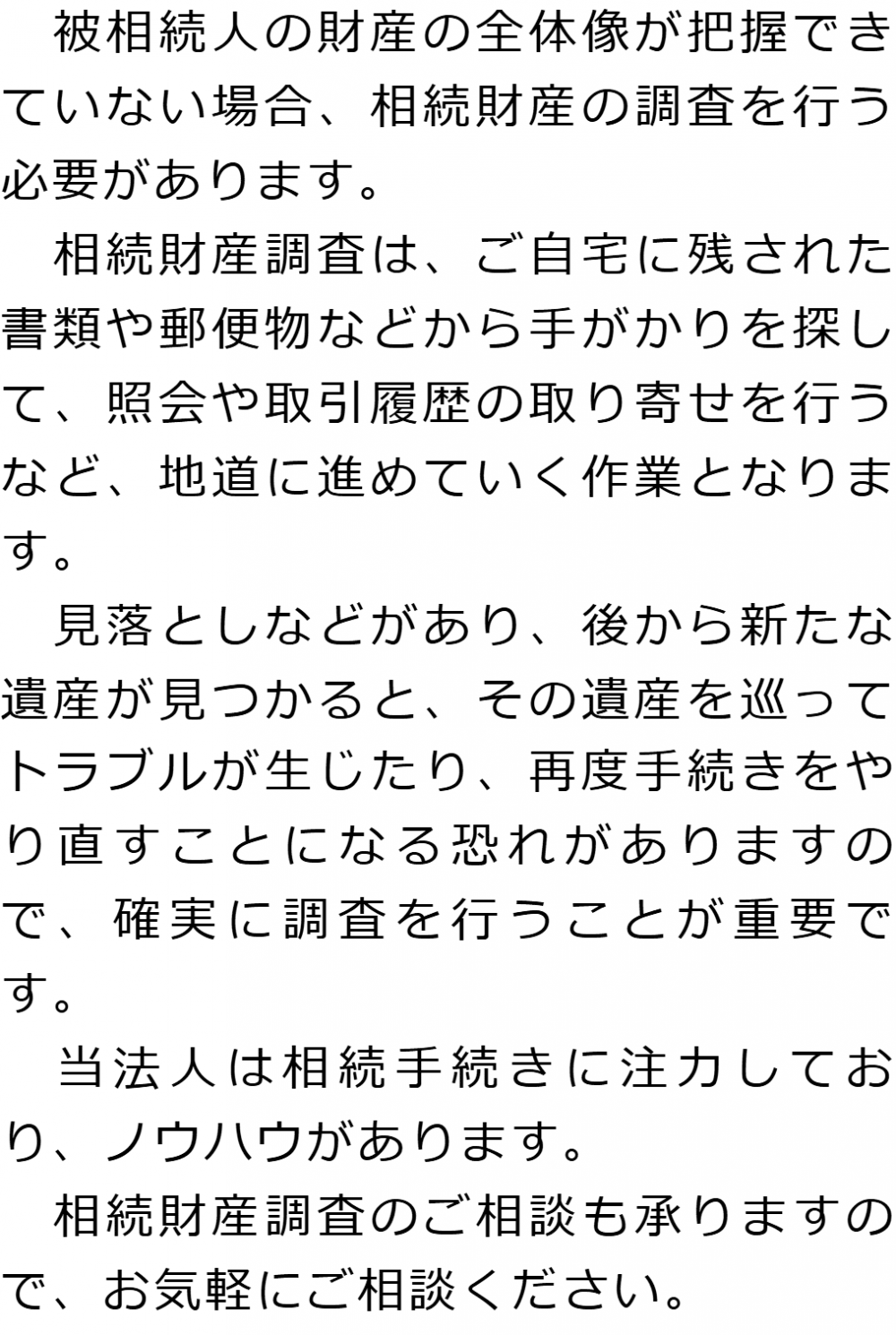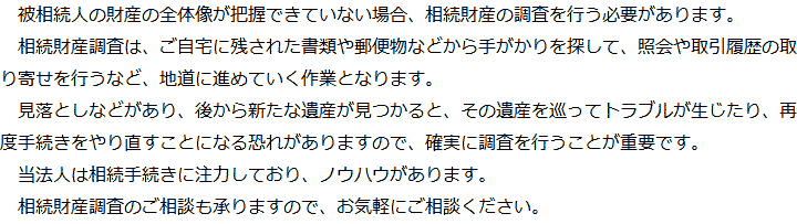 トップ業務内容相続財産調査 階層構造▼ 業務内容(目次) 相続財産調査 業務内容(目次)業務内容トップ行政書士法人相続百花の業務内容遺言遺産整理相続人調査相続財産調査遺産分割協議書の作成預金・貯金の解約・名義変更証券口座の解約・名義変更自動車の名義変更心グループのその他の業務内容家族信託・民事信託節税対策事業承継遺言の検認相続放棄限定承認遺産分割遺留分侵害額請求相続登記相続税申告相続税調査 受付時間 平日 9時~21時、土日祝 9時~18時 夜間・土日祝の相談も対応します (要予約) 所在地 〒060-0808 北海道札幌市北区北8条西4‐1-1パストラルビルN8 2F 0120-15-2403 お問合せ・アクセス・地図