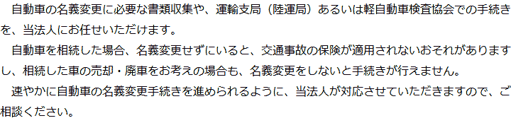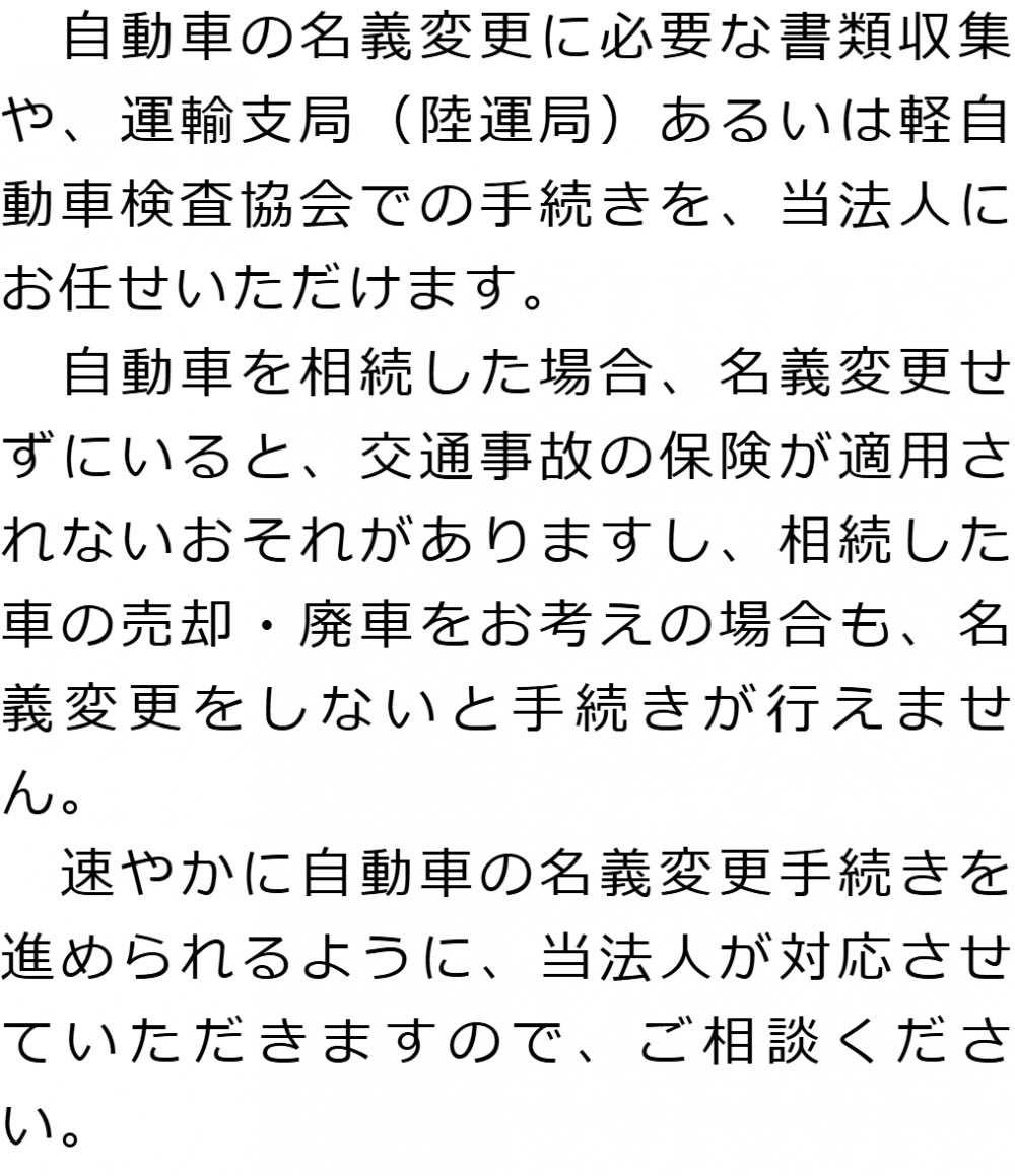 トップ業務内容自動車の名義変更 階層構造▼ 業務内容(目次) 自動車の名義変更 業務内容(目次)業務内容トップ行政書士法人相続百花の業務内容遺言遺産整理相続人調査相続財産調査遺産分割協議書の作成預金・貯金の解約・名義変更証券口座の解約・名義変更自動車の名義変更心グループのその他の業務内容家族信託・民事信託節税対策事業承継遺言の検認相続放棄限定承認遺産分割遺留分侵害額請求相続登記相続税申告相続税調査 受付時間 平日 9時~21時、土日祝 9時~18時 夜間・土日祝の相談も対応します (要予約) 所在地 〒060-0808 北海道札幌市北区北8条西4‐1-1パストラルビルN8 2F 0120-15-2403 お問合せ・アクセス・地図